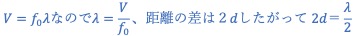 距離の差がλ/2の奇数倍になれば良い。「振動数をfから徐々に低下させると、振動数がf0[Hz]のとき