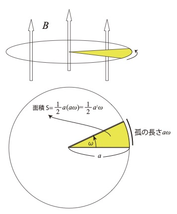 \( V=\dfrac{Δφ}{Δt}=\dfrac{B(\dfrac{a^2ω}{2})}{1}=\dfrac{Ba^2ω}{2} \)となります。