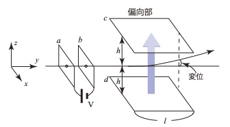 加速度を生じる。偏向部を通過するのにかかる時間は\( \dfrac{l}{v_0} \)
