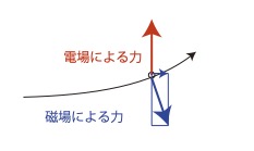 さらに偏向部の通過時には進行方向に対して垂直に磁場から力を受け、電場から鉛直上向きに力を受ける。
